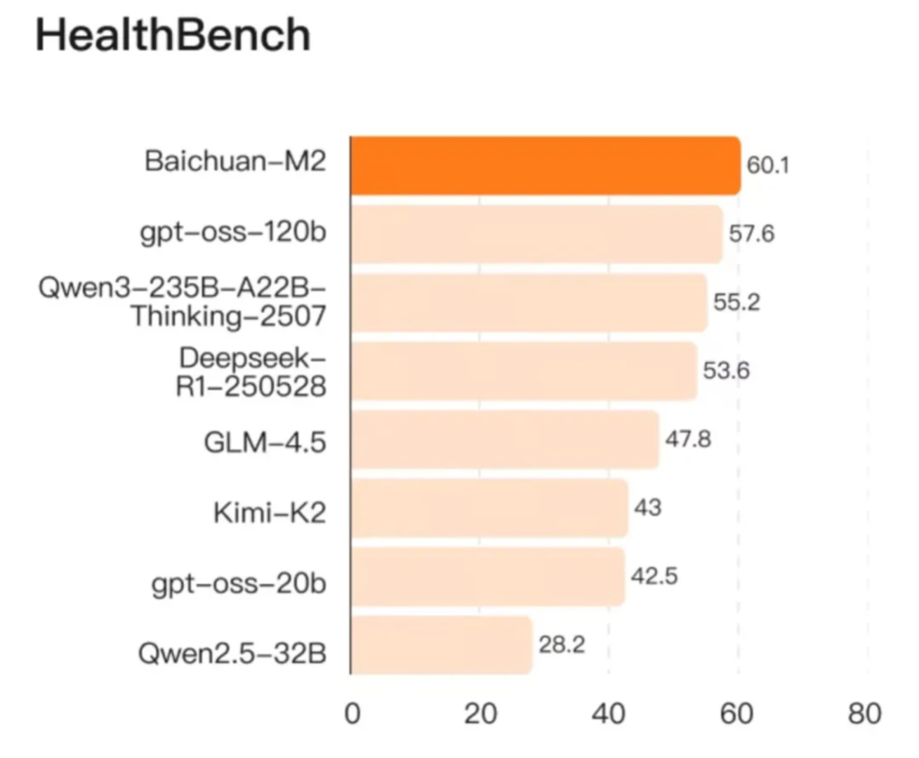 Baichuan-M2在HealthBench上得到60.1的高分,以32B的較小尺寸不僅反超OpenAI 最新開源模型gpt-oss120b(得分57.6),更是力壓Qwen3-235B、DeepSeek-R1、Kimi-K2等當前世界所有開源大模型。
