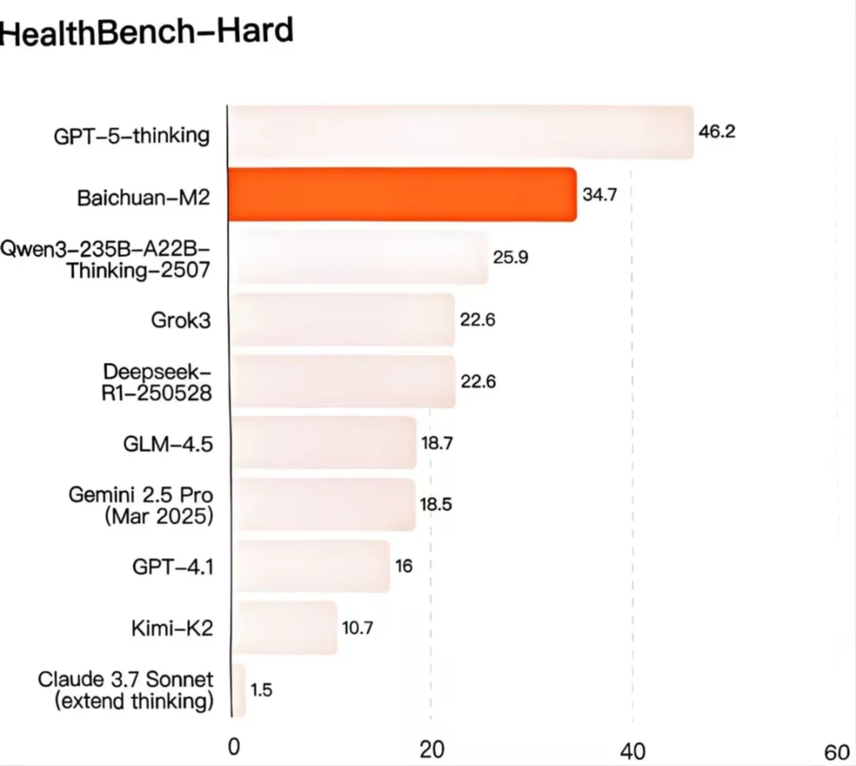HealthBench-Hard作為驗證模型多維度、全景化解決疑難復雜醫學問題能力的評測集,更能反映模型面臨“千奇百怪”復雜條件時的真實能力。在該評測中,Baichuan-M2以34.7的高分排名全球第二,醫療復雜問題處理比肩GPT-5。